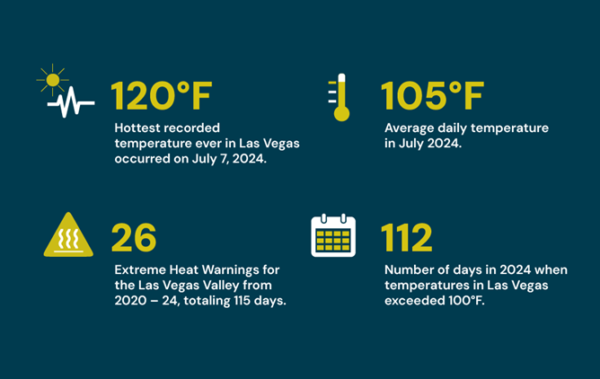 Staying cool in Clark County can be challenging, especially because not everyone experiences heat the same way. Due to the Urban Heat Island (UHI) effect, some of our neighborhoods are hotter than others. Although our extreme temperatures impact our vulnerable residents the most, everyone is exposed to extreme heat here in Clark County.