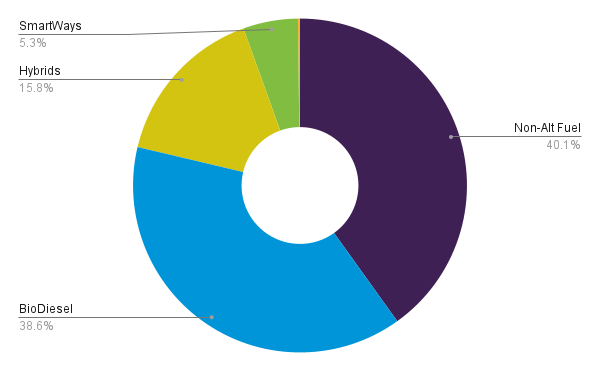 Clark County is a leader in fuel-efficient and alternative vehicles. In fact, Clark County operates the largest alternative fuel fleet in Nevada. Hybrids and biodiesel vehicles alone, shown in the chart to the left in green and yellow, make up 55% of fleet vehicles!