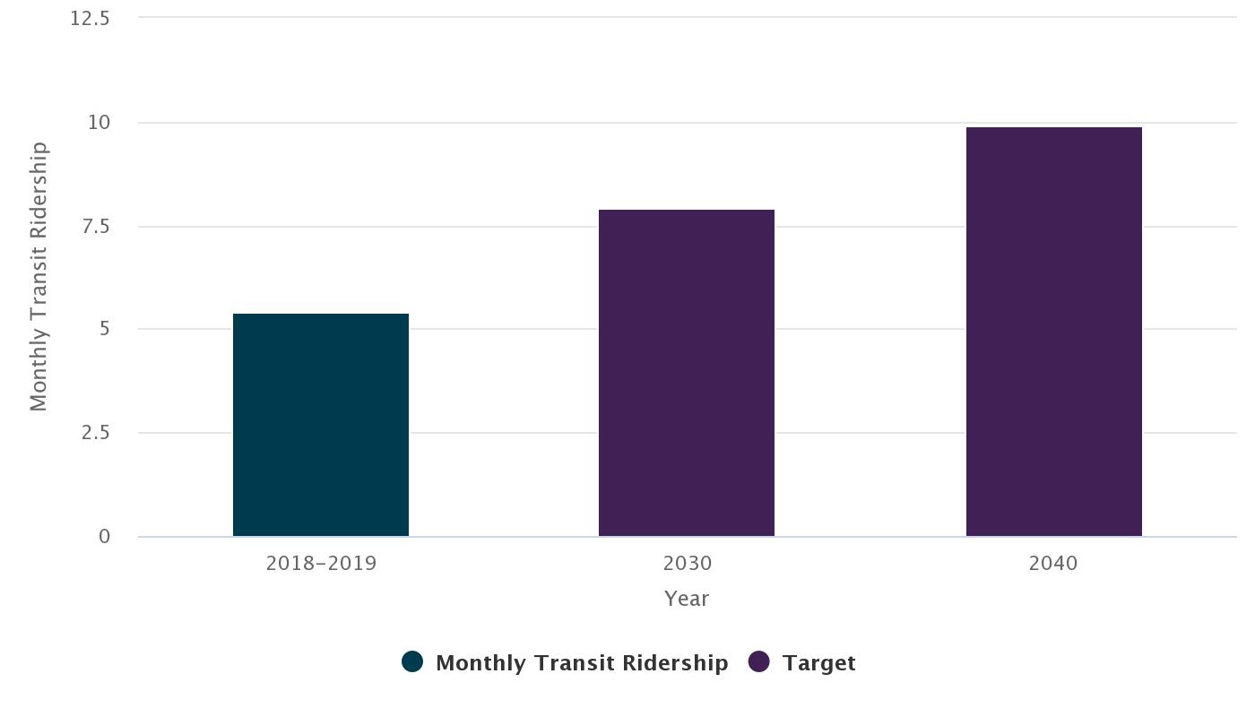 In addition to electrifying our passenger vehicles, we need to improve and promote the most energy efficient modes of transportation including transit and bicycling. In 2018-2019, monthly transit ridership was 5.4 million. In order to meet our emissions goals, Clark County aims to increase the average monthly transit ridership to 7.9 million by 2030 and 9.9 million by 2040.